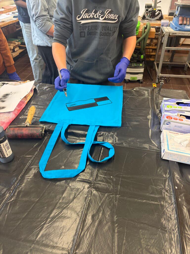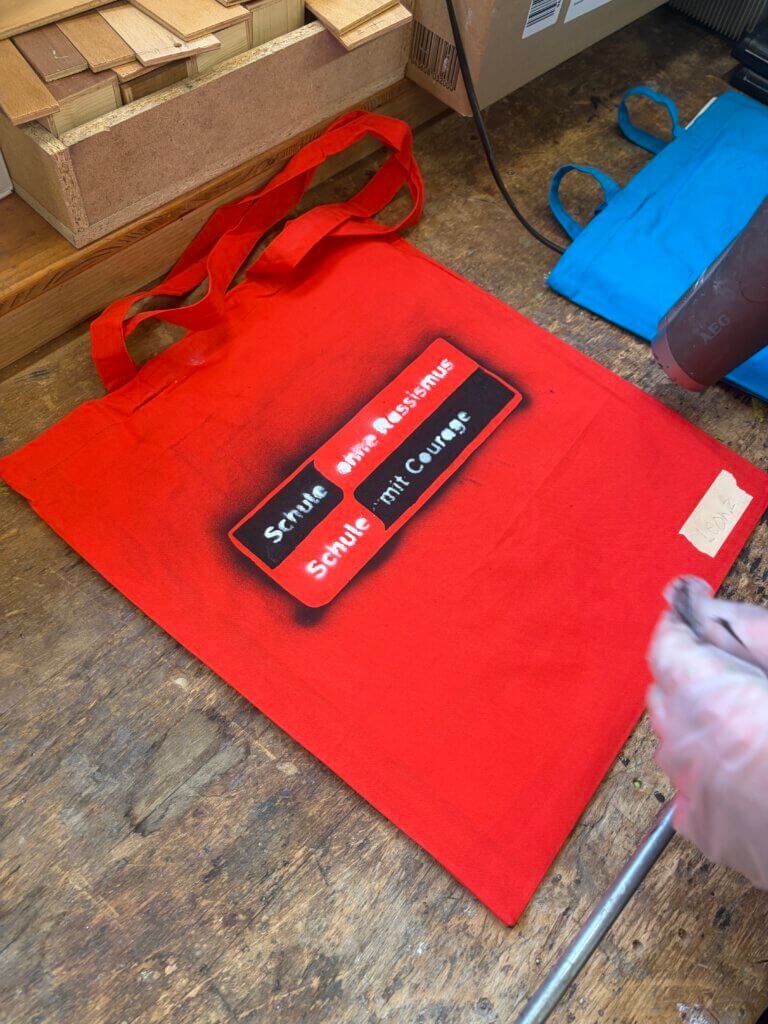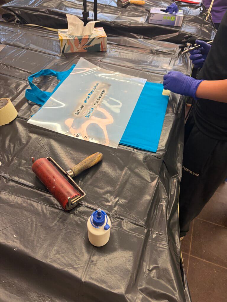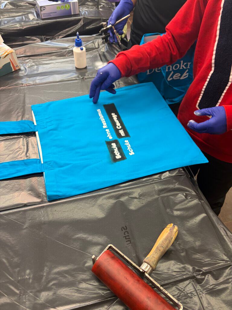 Im Werkraum wurde es kreativ: Beim Airbrush-Workshop gestalteten Schülerinnen und Schüler Stofftaschen, die durch das Projekt „Demokratie leben!“ gespendet wurden.