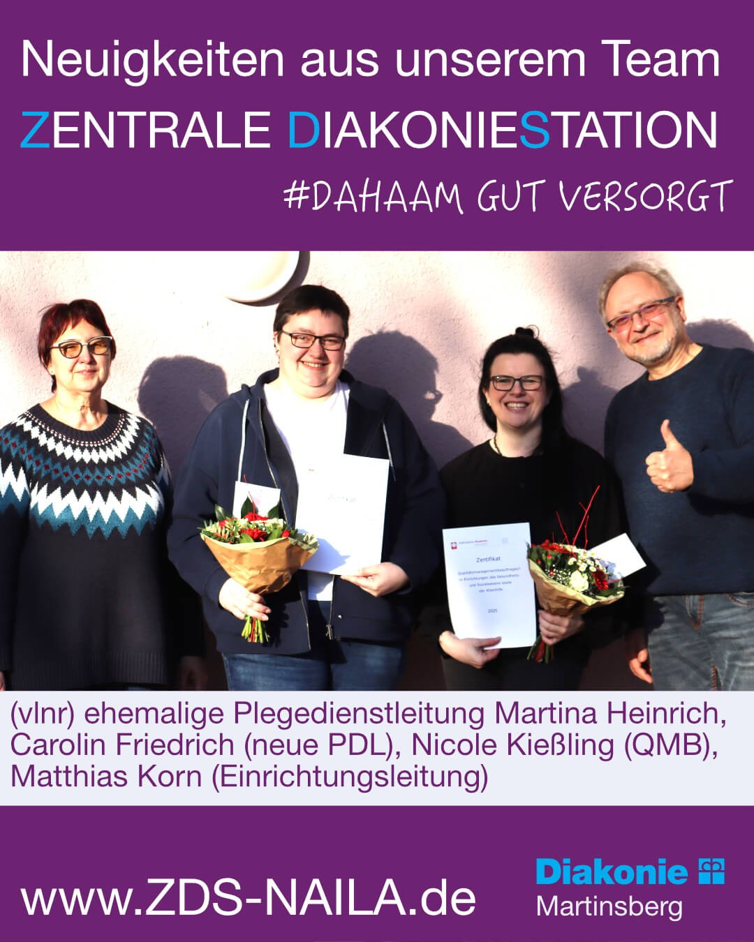 Die Position der Pflegedienstleitung hat nun Frau Carolin Friedrich übernommen. Wir freuen uns sehr über ihre neue Aufgabe und wünschen ihr für diese verantwortungsvolle Tätigkeit viel Erfolg, Kraft und Gottes Segen.