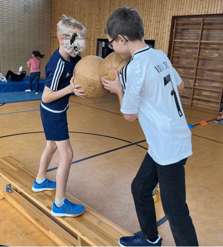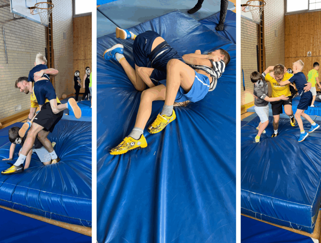 Nach einer gemeinsamen Erwärmung erklärte der Sportlehrer zunächst die wichtigen Regeln, die für Sicherheit und Fairness sorgen, z.B. Wenn jemand „Stopp!“ ruft, wird sofort aufgehört – niemand darf verletzt werden, und Fair Play steht immer an erster Stelle.