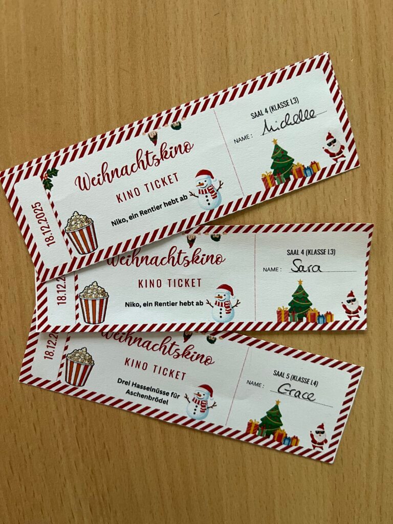 Die Klassenzimmer verwandelten sich in viele kleine Kinosäle. In jedem Raum wurde ein anderer Weihnachtsfilm gezeigt. Die Schülerinnen und Schüler durften selbst entscheiden, welchen Film sie anschauen wollten. So konnten sie sich auch mit Freundinnen und Freunden aus anderen Klassen treffen und gemeinsam einen Film genießen.